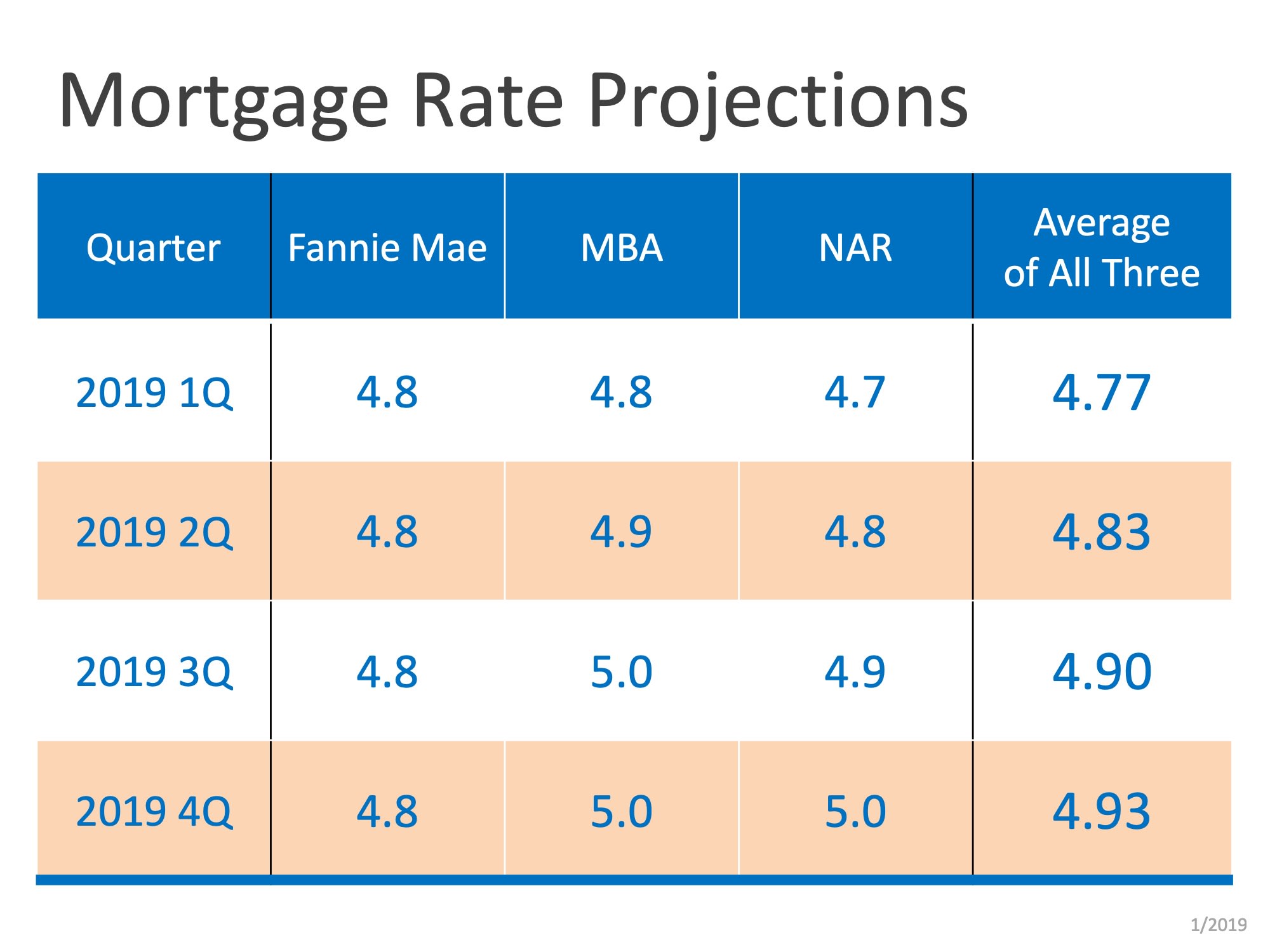 According to the latest forecasts from Fannie Mae, the Mortgage Bankers Association, and the National Association of Realtors®, mortgage rates will increase over the course of 2019, but not at the same pace they did in 2018. You can see the forecasts broken down by quarter below.